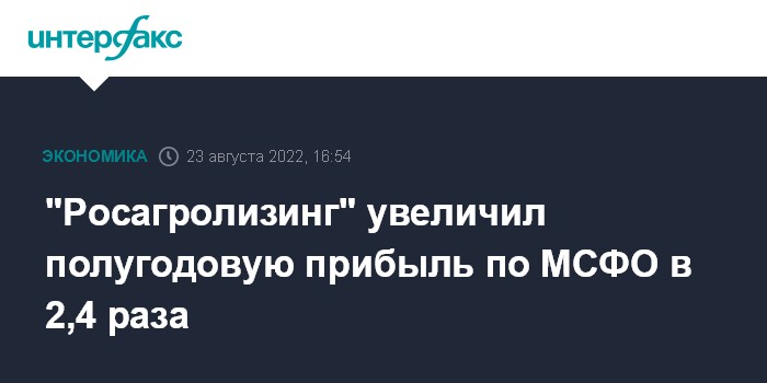 Москва. 23 августа. INTERFAX.RU - В I полугодии 2022 года чистая прибыль "Росагролизинга" по МСФО составила 1,353 млрд рублей, что в 2,4 раза больше, чем за аналогичный период прошлого года, сообщила пресс-служба компании.