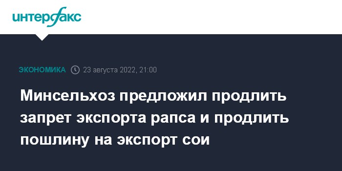 Министерство также предлагает продлить пошлину на экспорт сои еще на два года, до 31 августа 2024 года.