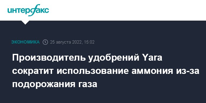 Москва. 25 августа. INTERFAX.RU - Норвежский производитель сельскохозяйственных удобрений Yara International ASA сообщил, что сократит использование аммония от 100% до 35% (3,1 млн тонн) в производстве азотных удобрений из-за рекордных цен на газ в Европе.