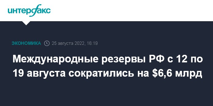 Международные резервы РФ с 12 по 19 августа сократились на $6,6 млрд