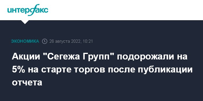 Москва. 26 августа. INTERFAX.RU - Акции ПАО "Сегежа Групп" подорожали на 5% на старте торгов в пятницу на "Мосбирже" после выхода отчета за первое полугодие и заявлений менеджмента о сохранении дивидендной политики.