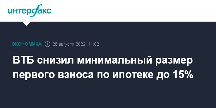 Москва. 26 августа. INTERFAX.RU - ВТБ снизил до 15% минимальный размер первого взноса в рамках собственных программ ипотеки, сообщила пресс-служба банка.