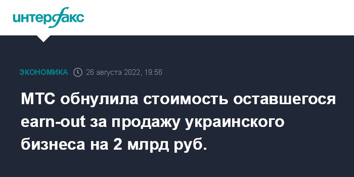 Москва. 26 августа. INTERFAX.RU - Часть дополнительного вознаграждения, предусмотренного структурой сделки по продаже украинского бизнеса ПАО "МТС" в 2019 году, не успела дойти до компании.