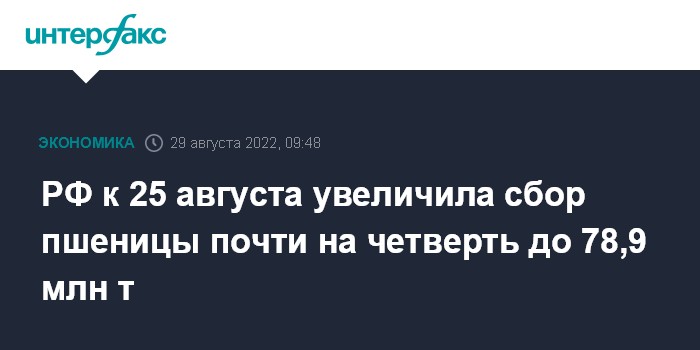Москва. 29 августа. INTERFAX.RU - РФ к 25 августа собрала 78,9 млн тонн зерна, что на 24,8% больше, чем на аналогичную дату прошлого года (63,2 млн тонн), сообщается в материалах Минсельхоза.