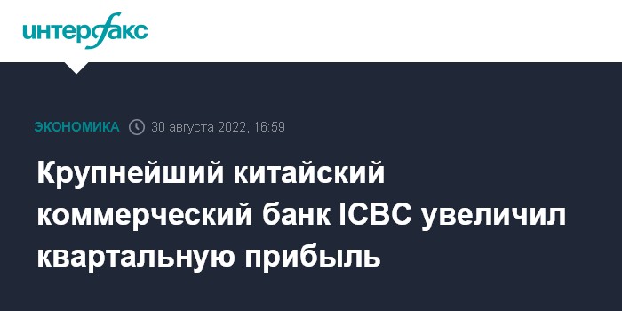 Москва. 30 августа. INTERFAX.RU - Крупнейший китайский коммерческий банк Industrial & Commercial Bank of China (ICBC) в первом полугодии 2022 года увеличил чистую прибыль благодаря росту портфеля кредитов и повышению процентного дохода.