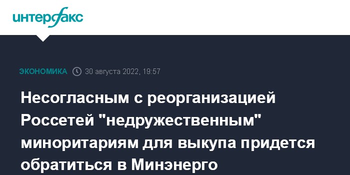 Несогласным с реорганизацией Россетей "недружественным" миноритариям для выкупа придется обратиться в Минэнерго