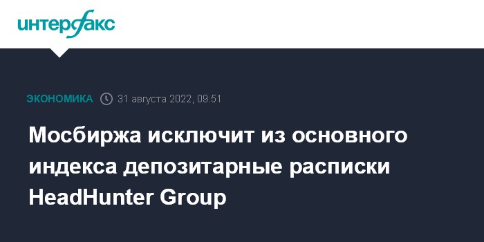 Москва. 31 августа. INTERFAX.RU - "Московская биржа" исключает из базы расчета индекса МосБиржи и индекса РТС депозитарные расписки HeadHunter Group PLC, говорится в сообщении биржи.