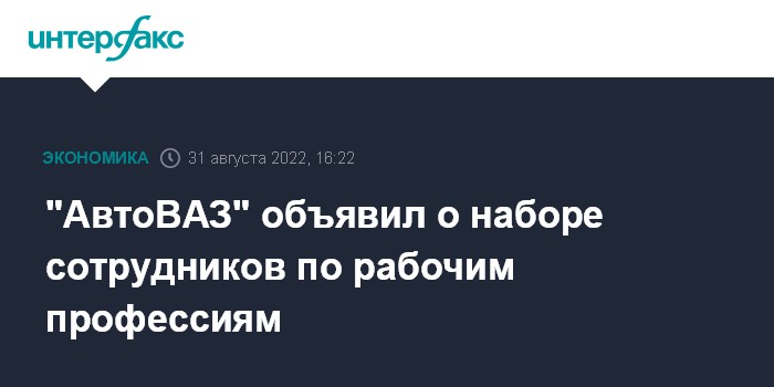 Москва. 31 августа. INTERFAX.RU - "АвтоВАЗ" объявил о наборе на постоянную работу сотрудников по рабочим профессиям, а также мастеров. Это следует из сообщения первичной профсоюзной организации предприятия в соцсети "ВКонтакте".