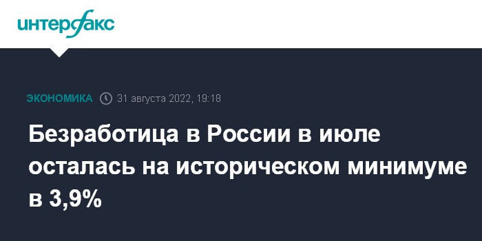Москва. 31 августа. INTERFAX.RU - Безработица в России в июле 2022 года не изменилась и осталась на минимальном с 1991 года значении в 3,9%, следует из данных Росстата. Этот уровень безработицы был достигнут в мае и сохранился в июне.