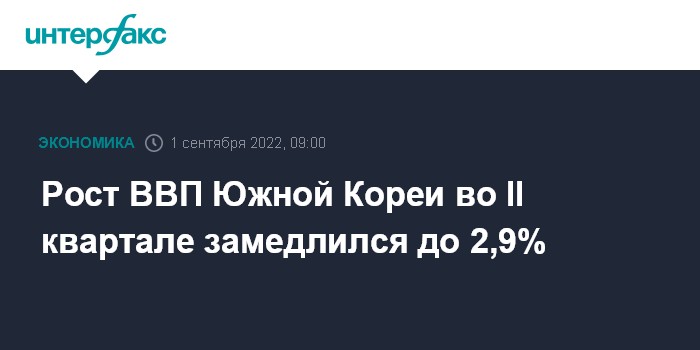 Москва. 1 сентября. INTERFAX.RU - Во II квартале 2022 года экономика Южной Кореи выросла на 2,9% в годовом исчислении, показали окончательные данные Банка Кореи. По сравнению с первым кварталом 2022 года ВВП страны увеличился на 0,7%.