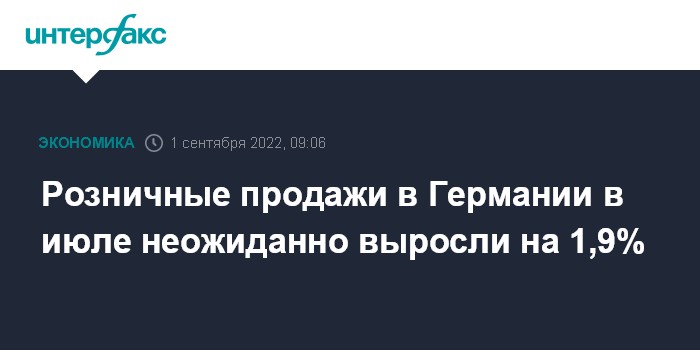 Москва. 1 сентября. INTERFAX.RU - В июле 2022 года розничные продажи в Германии неожиданно выросли на 1,9% к июню, показали данные Федерального статистического агентства страны (Destatis). Темпы повышения показателя стали максимальными с июня 2021 года.