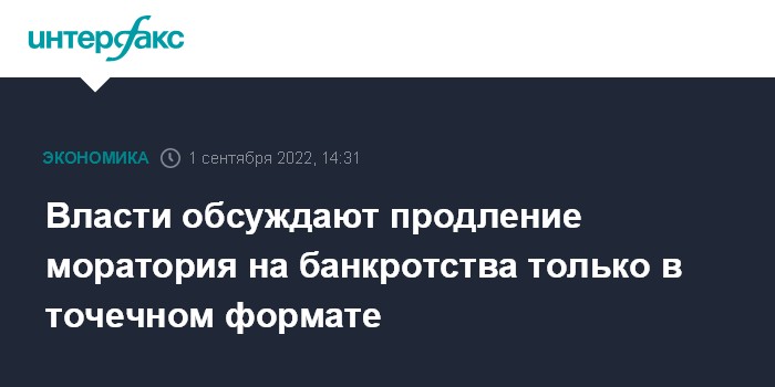 Москва. 1 сентября. INTERFAX.RU - В правительстве изучают ситуацию в различных отраслях экономики, чтобы решить, стоит ли продлевать после 1 октября мораторий на банкротства и взыскания исключительно для организаций, пострадавших от антироссийских санкций, рассказал источник "Интерфакса", знакомый с ходом дискуссий.