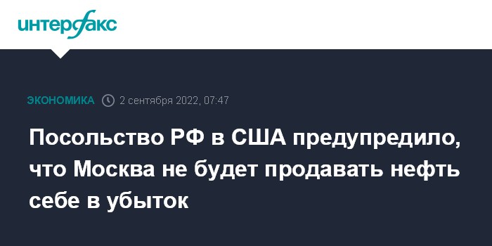 Москва. 2 сентября. INTERFAX.RU - Посольство РФ в Вашингтоне отреагировало на сообщение о предложении американских властей установить ценовой потолок на российскую нефть, заявив, что Москва не станет поставлять топливо на нерыночных условиях.
