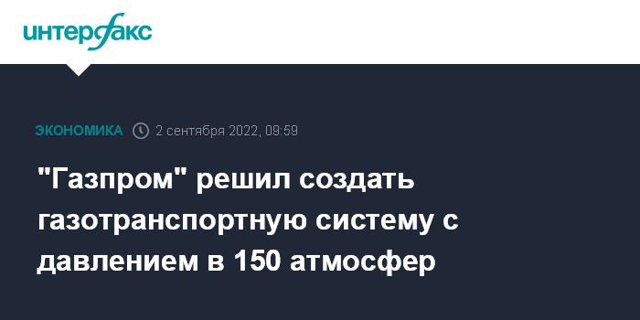 Москва. 2 сентября. INTERFAX.RU - "Газпром" принял решение о создании газотранспортной системы с рабочим давлением в 150 атмосфер (14,8 МПа), заявил зампред правления компании Олег Аксютин на Дне поставщика "Газпрома" в ходе Татарстанского нефтегазохимического форума.