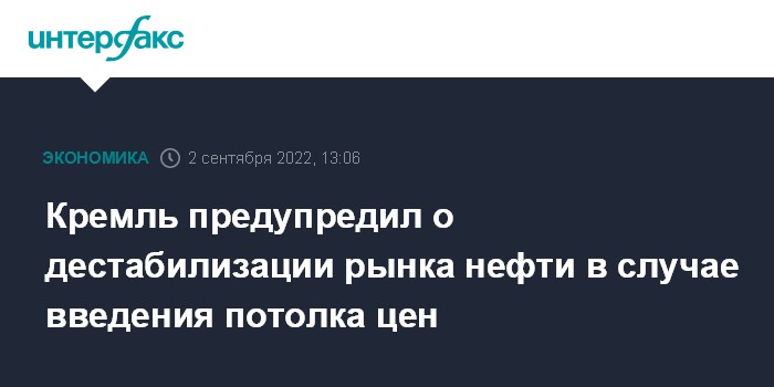 Москва. 2 сентября. INTERFAX.RU - Введение потолка цен российскую нефть приведет к существенной дестабилизации нефтяных рынков, убеждены в Кремле. Об этом на брифинге заявил пресс-секретарь президента Дмитрий Песков.