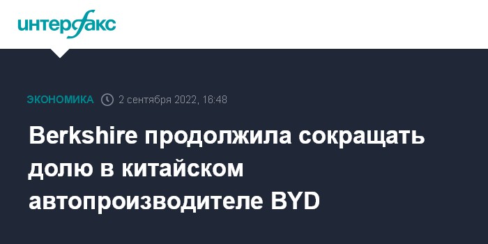 Москва. 2 сентября. INTERFAX.RU - Инвестиционная компания американского миллиардера Уоррена Баффета Berkshire Hathaway продолжает сокращать свою долю в BYD Co., ведущем производителе автомобилей на новых источниках энергии (NEV) в Китае.