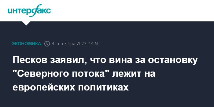Москва. 4 сентября. INTERFAX.RU - Пресс-секретарь президента РФ Дмитрий Песков возложил на европейских политиков вину за остановку газопровода "Северный поток".