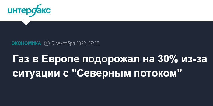 Москва. 5 сентября. INTERFAX.RU - Спотовая цена газа в Европе растет на 30%, почти до $2900/тыс. куб. м из-за продолжающейся остановки "Северного потока".