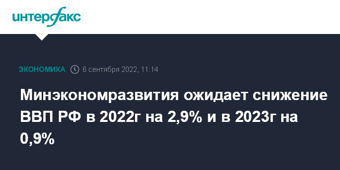 Минэкономразвития ожидает снижение ВВП РФ в 2022г на 2,9% и в 2023г на 0,9%
