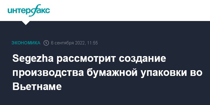 Москва. 6 сентября. INTERFAX.RU - Подконтрольный АФК "Система" лесопромышленный холдинг Segezha Group изучает возможность размещения во Вьетнаме мощностей по производству бумажной упаковки с перспективой поставок на рынки стран АСЕАН.
