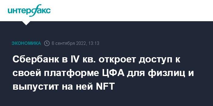 Москва. 6 сентября. INTERFAX.RU - Сбербанк в четвертом квартале 2022 года планирует расширить возможности своей платформы цифровых финансовых активов (ЦФА): начать выпускать на ней NFT (токены на визуальные произведения) и обеспечить физическим лицам доступ к платформе, сообщил журналистам зампред правления банка Анатолий Попов в кулуарах Восточного экономического форума (ВЭФ).