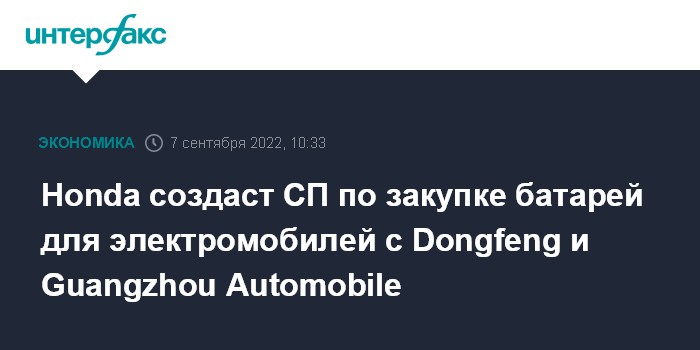 Москва. 7 сентября. INTERFAX.RU - Японский автоконцерн Honda Motor Co создает совместное предприятие с китайскими производителями автомашин Dongfeng Motor Group Co и Guangzhou Automobile Group Co для закупки батарей для электромобилей, пишет MarketWatch.