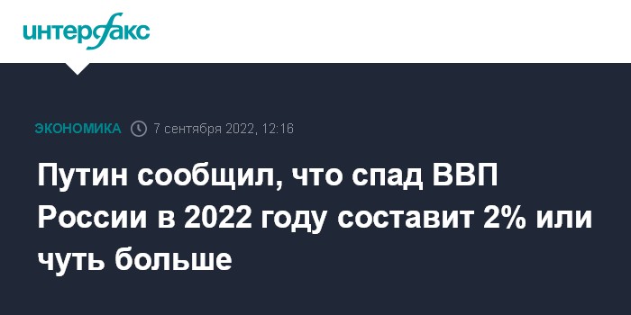 Москва. 7 сентября. INTERFAX.RU - Снижение ВВП РФ в 2022 году будет незначительным, составит 2%, может чуть больше, сообщил президент России Владимир Путин, выступая в среду на пленарном заседании Восточного экономического форума.