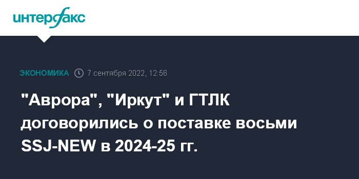 Москва. 7 сентября. INTERFAX.RU - Авиакомпания "Аврора", "Корпорация "Иркут" (входит в "ОАК" "Ростеха") и "Государственная транспортная лизинговая компания" (ГТЛК) подписали соглашение об основных условиях поставки восьми самолетов SSJ-NEW в 2024-2025 годах.