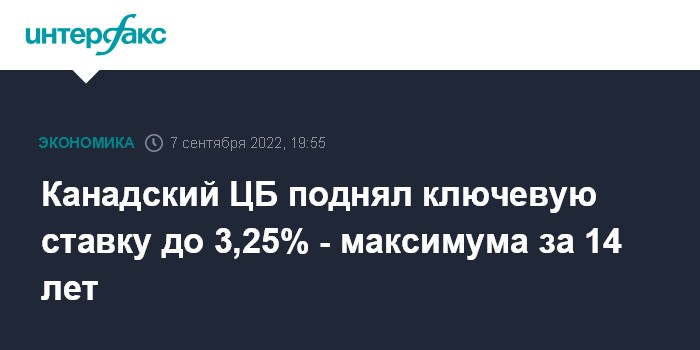 Москва. 7 сентября. INTERFAX.RU - Банк Канады на заседании в среду повысил ключевую процентную ставку "овернайт" на 0,75 процентного пункта, до 3,25% годовых, и сигнализировал о готовности продолжать увеличение стоимости заимствований для сдерживания инфляции.