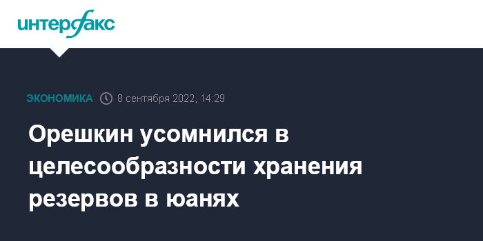 Москва. 8 сентября. INTERFAX.RU - Помощник президента РФ Максим Орешкин не разделяет общий оптимизм относительно перспектив юаня как системообразующей валюты для российских резервов в условиях, когда доллар и евро из-за санкций стали "токсичными".