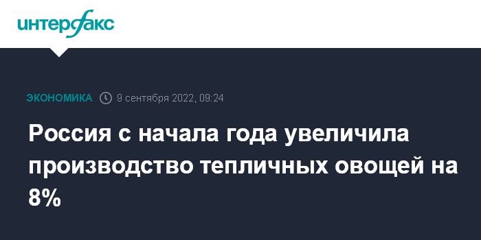 Москва. 9 сентября. INTERFAX.RU - Тепличная отрасль РФ с начала года вырастила 1,1 млн тонн овощей, что на 7,9% больше, чем за аналогичный период прошлого года, сообщает Минсельхоз.