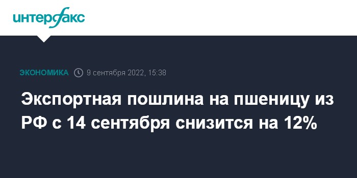 Москва. 9 сентября. INTERFAX.RU - Экспортная пошлина на пшеницу из РФ с 14 сентября снизится до 2 962,9 рубля с 3 368,9 рубля за тонну неделей ранее, сообщил Минсельхоз.