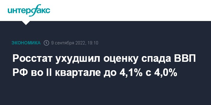 Москва. 9 сентября. INTERFAX.RU - Снижение ВВП РФ во II квартале 2022 года составило 4,1% в годовом выражении после роста на 3,5% в I квартале. Росстат в пятницу опубликовал первую оценку этого показателя за второй квартал.