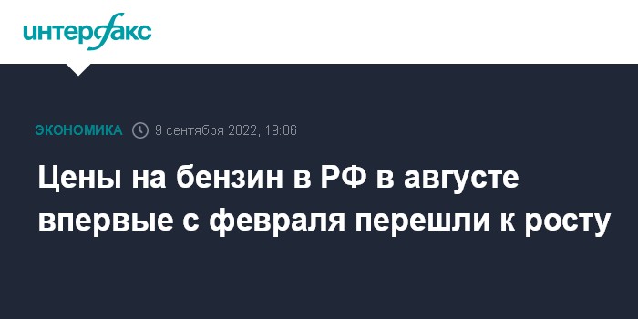 Москва. 9 сентября. INTERFAX.RU - Потребительские цены на бензин в РФ в августе 2022 года впервые с февраля этого года перешли к росту, увеличившись по сравнению с предыдущим месяцем на 0,32% после снижения на 0,05% в июле, на 0,14% в июне, на 0,18% в мае, на 0,2% в апреле, на 0,15% в марте. Это следует из сообщения Федеральной службы государственной статистики (Росстат).
