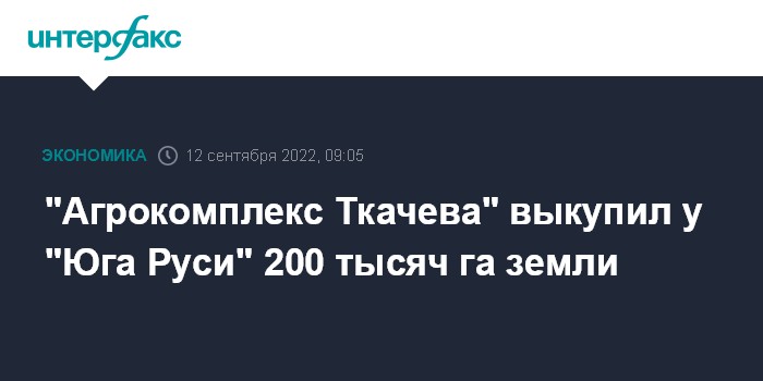 Об интересе "Агрокомплекса имени Ткачева" к землям "Юга Руси" сообщалось еще осенью 2021 года. В "Юге Руси" позже заявили, что информация о продаже земель "не соответствует действительности", а компания заинтересована в дальнейшем развитии. 9 сентября "Юг Руси" и "Агрокомплекс имени Ткачева" комментарии не предоставили.
