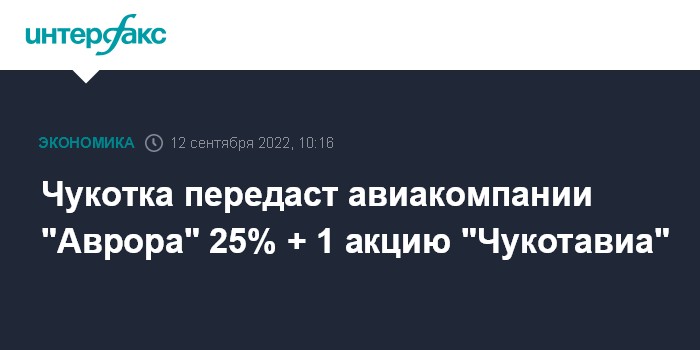 Москва. 12 сентября. INTERFAX.RU - Чукотка передаст 25% + 1 акцию принадлежащей региону авиакомпании "Чукотавиа" дальневосточной авиакомпании "Аврора", сообщила пресс-служба аппарата губернатора и правительства Чукотского автономного округа.