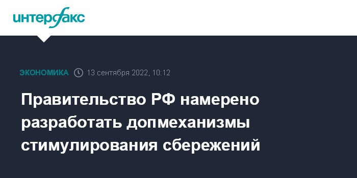 Москва. 13 сентября. INTERFAX.RU - Минфин и Минэкономразвития при участии Банка России не позднее 31 марта 2023 года должны представить в правительство предложения о дополнительных механизмах стимулирования и поощрения долгосрочных сбережений граждан.