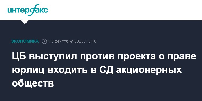 Москва. 13 сентября. INTERFAX.RU - Банк России не поддержал законопроект Минэкономразвития, который предусматривает возможность вхождения юридических лиц в советы директоров акционерных обществ (АО). Об этом рассказал источник "Интерфакса", знакомый с позицией регулятора. Если Минэкономразвития видит в этой реформе инструмент борьбы с санкциями, то ЦБ приводит аргументы в пользу того, что риски ограничительных мер наоборот вырастут.