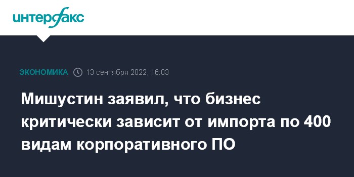 Москва. 13 сентября. INTERFAX.RU - Правительство выявило почти 400 видов корпоративного программного обеспечения (ПО), по которым бизнес критически зависит от импорта, заявил премьер-министр РФ Михаил Мишустин.