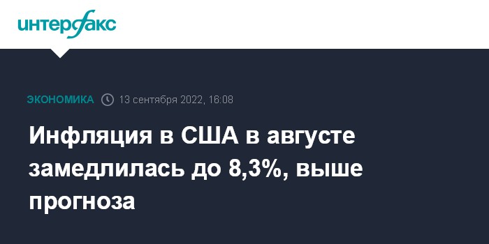 Москва. 13 сентября. INTERFAX.RU - В США в августе 2022 года потребительские цены выросли на 8,3% в годовом измерении, сообщило Минтруда страны. Инфляция замедлилась по сравнению 8,5% в июле, но оказалась выше 8,1%, как ожидали аналитики, опрошенные агентством Bloomberg.