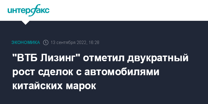 Москва. 13 сентября. INTERFAX.RU - "ВТБ Лизинг" (ВТБЛ, лизинговая "дочка" ВТБ) по итогам 8 месяцев 2022 года передал клиентам вдвое больше автомобилей и спецтехники китайских брендов, чем за аналогичный период прошлого года, сообщила компания.