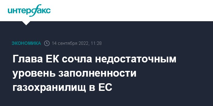 Москва. 14 сентября. INTERFAX.RU - Газохранилища в странах Евросоюза заполнены на 84%, но этого недостаточно для решения вопроса о зависимости от российских энергоносителей, заявила в среду глава Еврокомиссии Урсула фон дер Ляйен.