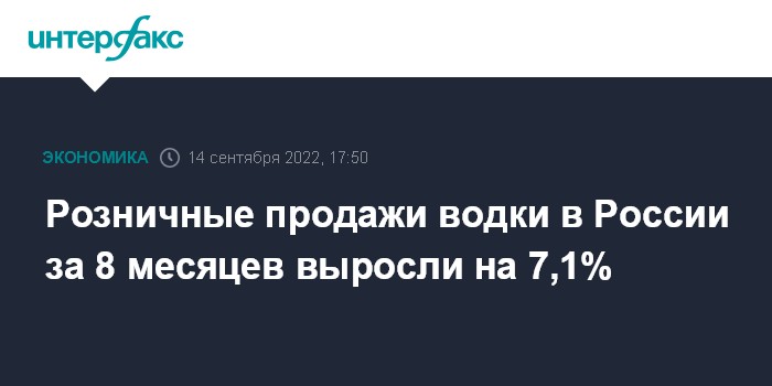 Москва. 14 сентября. INTERFAX.RU - В январе-августа 2022 года розничные продажи водки в России составили 49,4 млн декалитров (дал), что на 7,1% больше, чем за аналогичный период прошлого года (46,1 млн дал), говорится в материалах Росалкогольрегулирования, с которыми ознакомился "Интерфакс".
