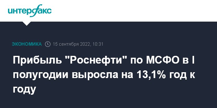 Москва. 15 сентября. INTERFAX.RU - Чистая прибыль "Роснефти" по МСФО в первом полугодии 2022 года выросла на 13,1% год к году, до 432 млрд руб., сообщила компания.