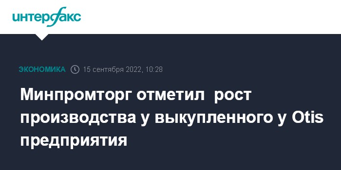 Москва. 15 сентября. INTERFAX.RU - Российское подразделение Otis Elevator Company, выкупленное холдингом S8 Capital в конце июля, показывает рост производства и количества рабочих мест, сообщили в пресс-службе Минпромторга.