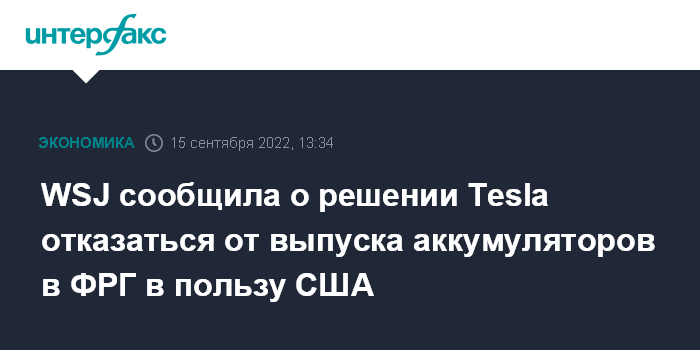 Москва. 15 сентября. INTERFAX.RU - Американский производитель электромобилей Tesla Inc. поставил на паузу план по производству аккумуляторов в Германии в связи с возможностью получить налоговые льготы в США, сообщает The Wall Street Journal со ссылкой на информированные источники.