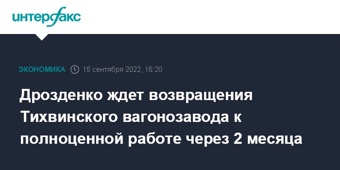 Москва. 15 сентября. INTERFAX.RU - Администрация Ленинградской области ожидает, что АО "Тихвинский вагоностроительный завод" (ТВСЗ, входит в "Объединенную вагонную компанию", ОВК), ушедшее в простой, в ближайшие два месяца восстановит работу по полному циклу, сообщил губернатор региона Александр Дрозденко.