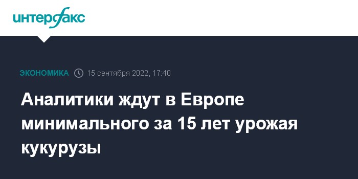 Москва. 15 сентября. INTERFAX.RU - В Европе в 2022 году урожай кукурузы может оказаться на минимуме за последние 15 лет из-за сильной засухи, говорится в докладе французской консалтинговой компании Strategie Grains.