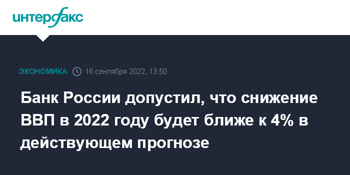 Москва. 16 сентября. INTERFAX.RU - Данные по ВВП России за II квартал и оперативные индикаторы указывают на то, что динамика деловой активности в стране складывается лучше, чем Банк России предполагал в июле, снижение ВВП в 2022 году будет ближе к 4% в действующем интервальном прогнозе (4-6%), говорится в сообщении ЦБ.