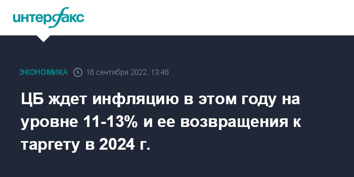 Москва. 16 сентября. INTERFAX.RU - ЦБ РФ улучшил прогноз по инфляции на 2022 год, теперь ждет ее в диапазоне 11-13% вместо ранее прогнозировавшихся 12-15%, говорится в сообщении регулятора по итогам заседания совета директоров.